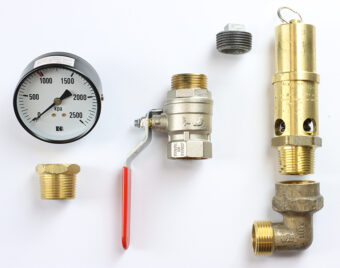 Work Health and Safety regulations stipulate that each air receiver must be fitted with a safety valve, pressure gauge and drain valve. These items can be purchased in a model-specific accessory kit for the Express Tank range of vertical air receivers.